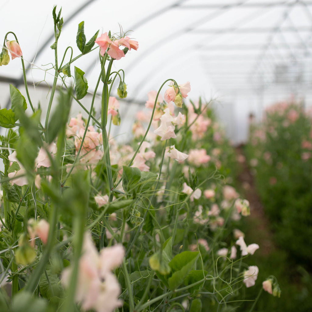 Castlewellan is gentle and romantic, perfect for wedding work. Bred by Sydney Harrod and introduced in 2005, it’s a Spencer sweet pea with softly ruffled blooms in the prettiest blush, peachy-pink tones. Beautifully scented with long, strong stems, it’s an absolute dream for cutting.