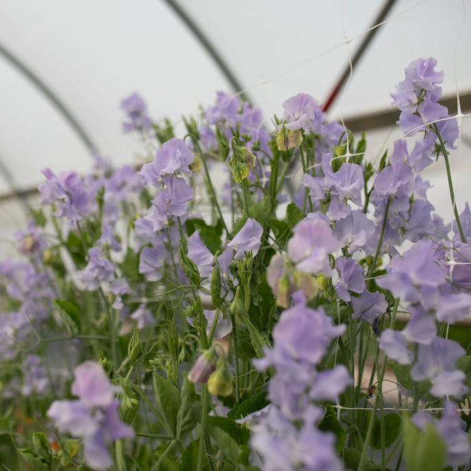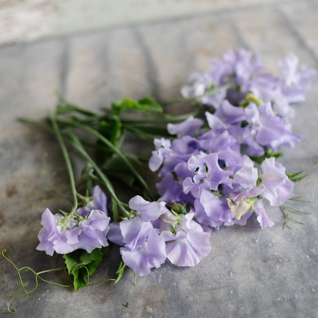 Charlie’s Angel is a beautiful Spencer sweet pea with large, softly ruffled silvery-blue blooms and a lovely sweet pea fragrance. Bred by Charlie Hanmer and introduced in 1990, it has long, strong stems that make it great for cutting and bouquets. The Royal Horticultural Society awarded Charlie’s Angel an Award of Garden Merit in 1993, which really says it all — it’s well worth growing.