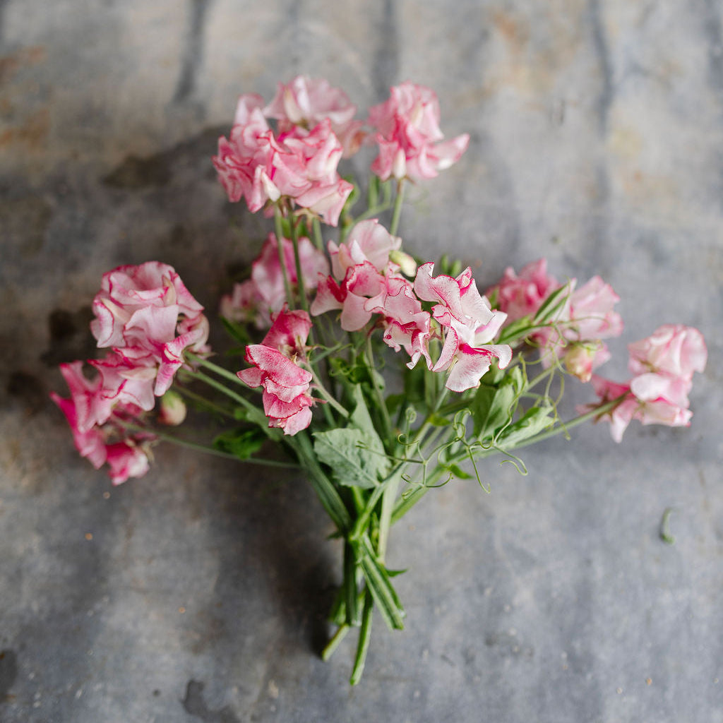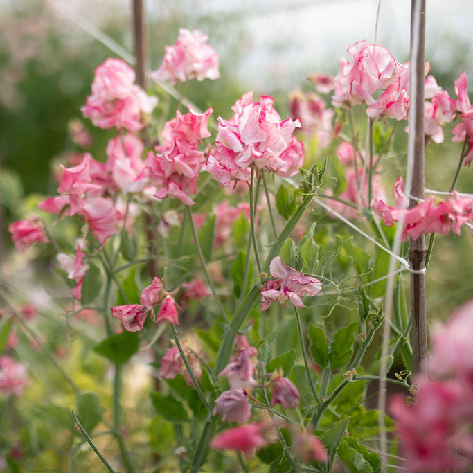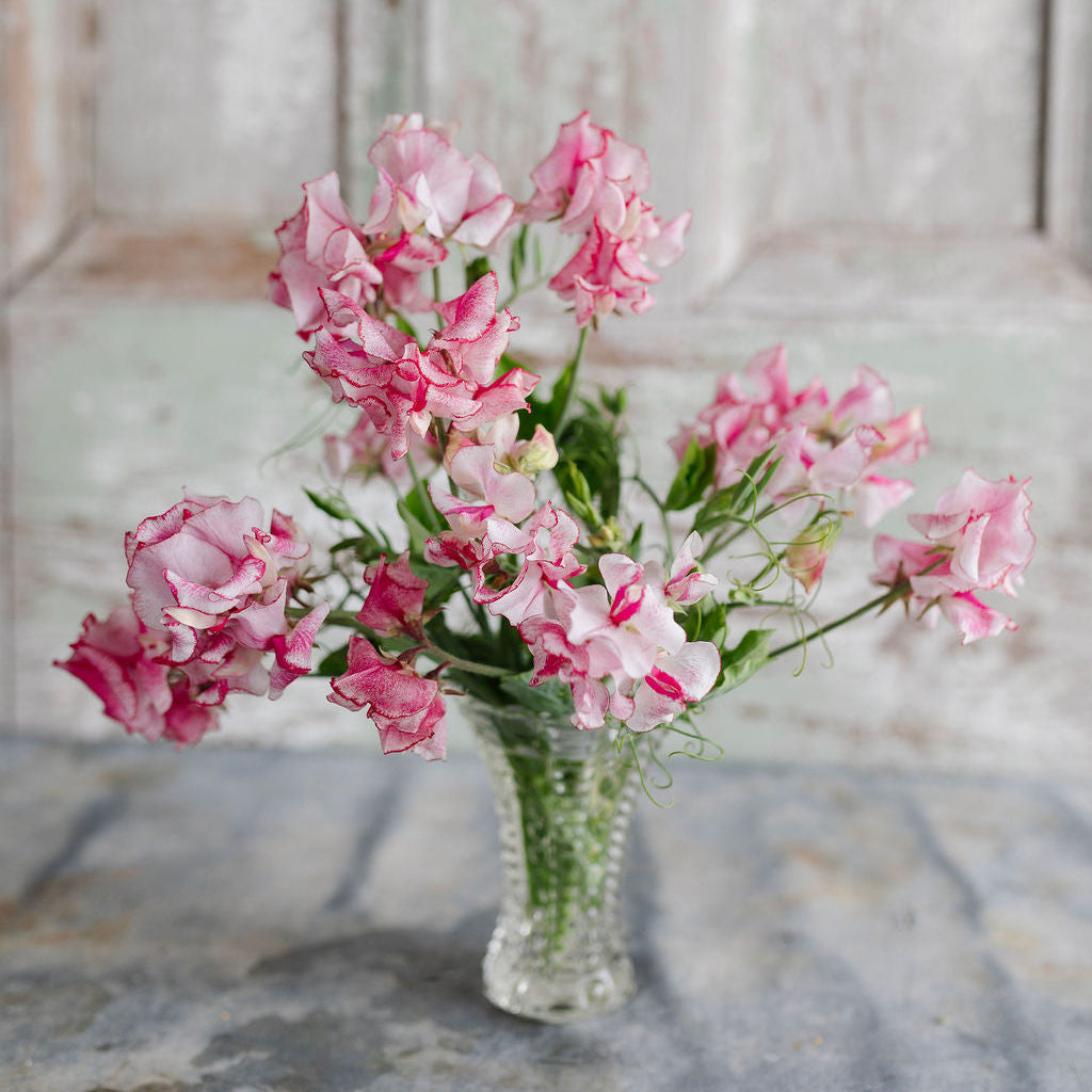 Marie’s Melody is a sweet little semi-dwarf variety that grows to about 4 feet tall, so it’s perfect for smaller trellises, raised beds, or containers. The blooms are crisp white with soft cherry pink-red brushing, giving them a bright, cheerful look. It’s a lovely option if you want all the beauty and fragrance of sweet peas without the full height.
