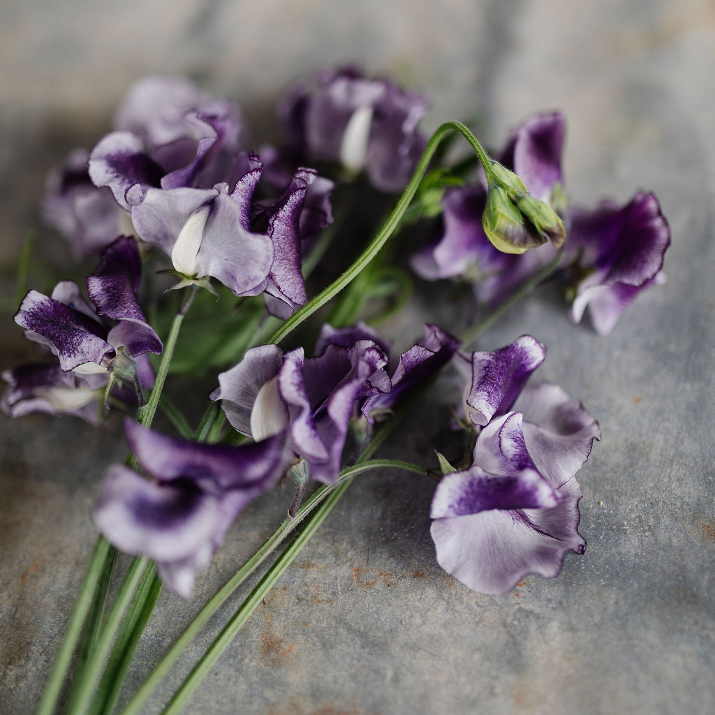 A striking sweet pea with a dark blue stripe on a crisp white background — very unusual and a real standout. Raised by John Robson in Scotland and gifted to Tom as an 80th birthday present a few years ago, it feels extra special. If Nimbus and Frances Kate had a baby, it would be Tom Atherton — fragrant, moody, and full of character.